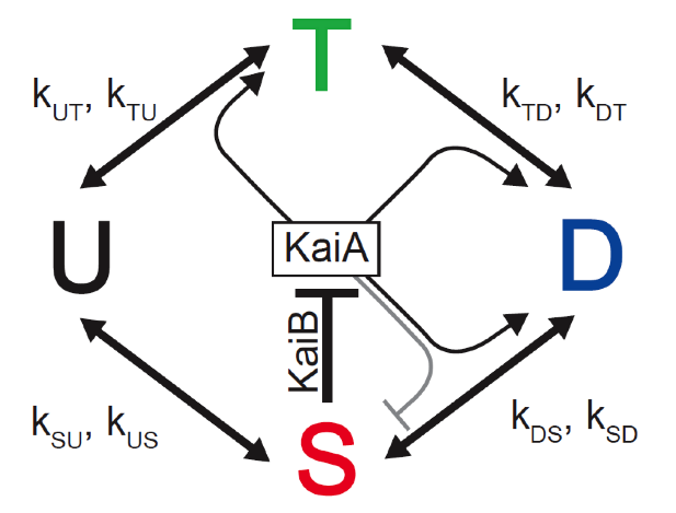 The KaiABC circuit is a protein-based circadian oscillator found in cyanobacteria. The main protein, KaiC, has two distinct phosphorylation sites. Therefore it has four possible states: unphosphorylated (U), phosphorylated at the threonine site (T), phosphorylated at the serine site (S), or phosphorylated at both sites (D).