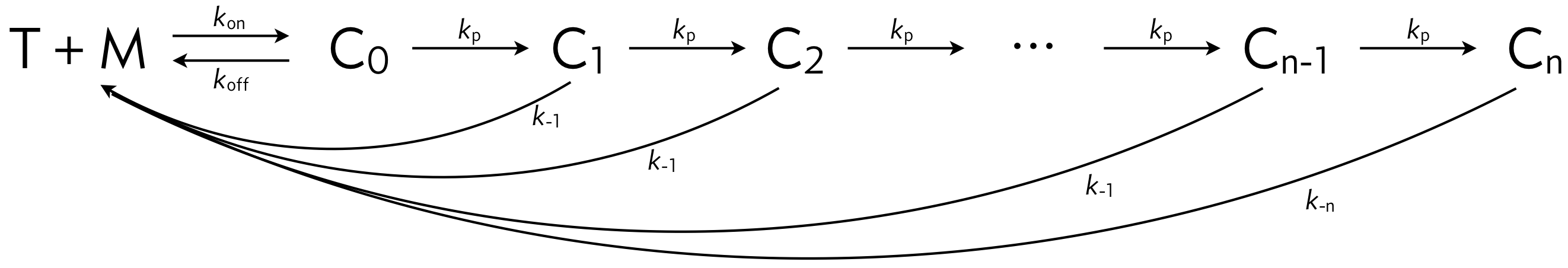 In class, we talked about kinetic proofreading in the context of translation. In this problem, we will consider a model for kinetic proofreading in the immune system. T cells recognize specific agonist major histocompatibility complexes (MHC) on an antigen presenting cell (APC). The APCs also have many endogenous MHCs that should not trigger T cell activation. It has been proposed that T cells are able to distinguish agonist MHCs (which should trigger T cell activation) and endogenous MHCs (which should not trigger T cell activation) via a kinetic proofreading mechanism. Such a mechanism is shown in below. In the figure, M = MHC and T = T cell receptor (TCR). The complexes \(\mathrm{C}_i\) denote MHC-TCR complexes with various stages of phosphorylation. In this model, all complexes may dissociate and “reset” to an unbound MHC and TCR. The rate of activation of T cells is proportional to the concentration of complex \(\mathrm{C}_n\). We say that \(\mathrm{C}_n\) is the “active form.”