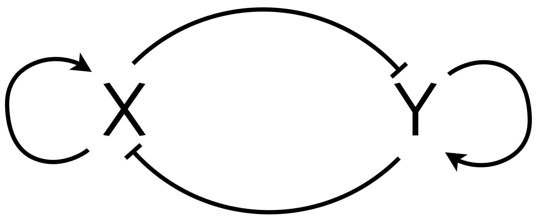 Common myeloid precursor (CMP) cells are stem cells that can either differentiate into an erythroid (red blood cell) cell or a myeloid (bone marrow) cell. Such a binary differentiation may be regulated by a genetic circuit akin to the toggle circuits we have already encountered. However, the progenitor state of the CMP cells is also stable, which suggests tristability of the underlying circuit. In particular, the transcription factors GATA1 (which we will call X for convenience) and PU.1 (which we will call Y) are mutually repressive, which gives them the toggle-like behavior. They also are autoactivating. These interactions are summarized in the circuit below.