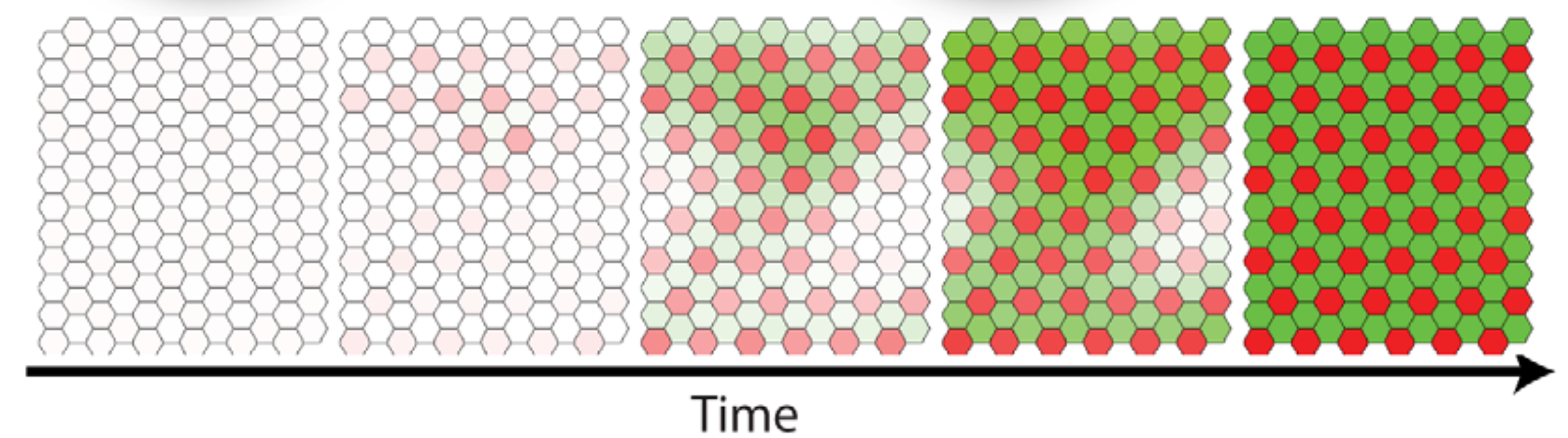 In such a lattice, patterning occurs spontaneously, as shown in the simulation below. Here, each hexagon in the grid represents a single cell and the two colors represent distinct gene expression states.