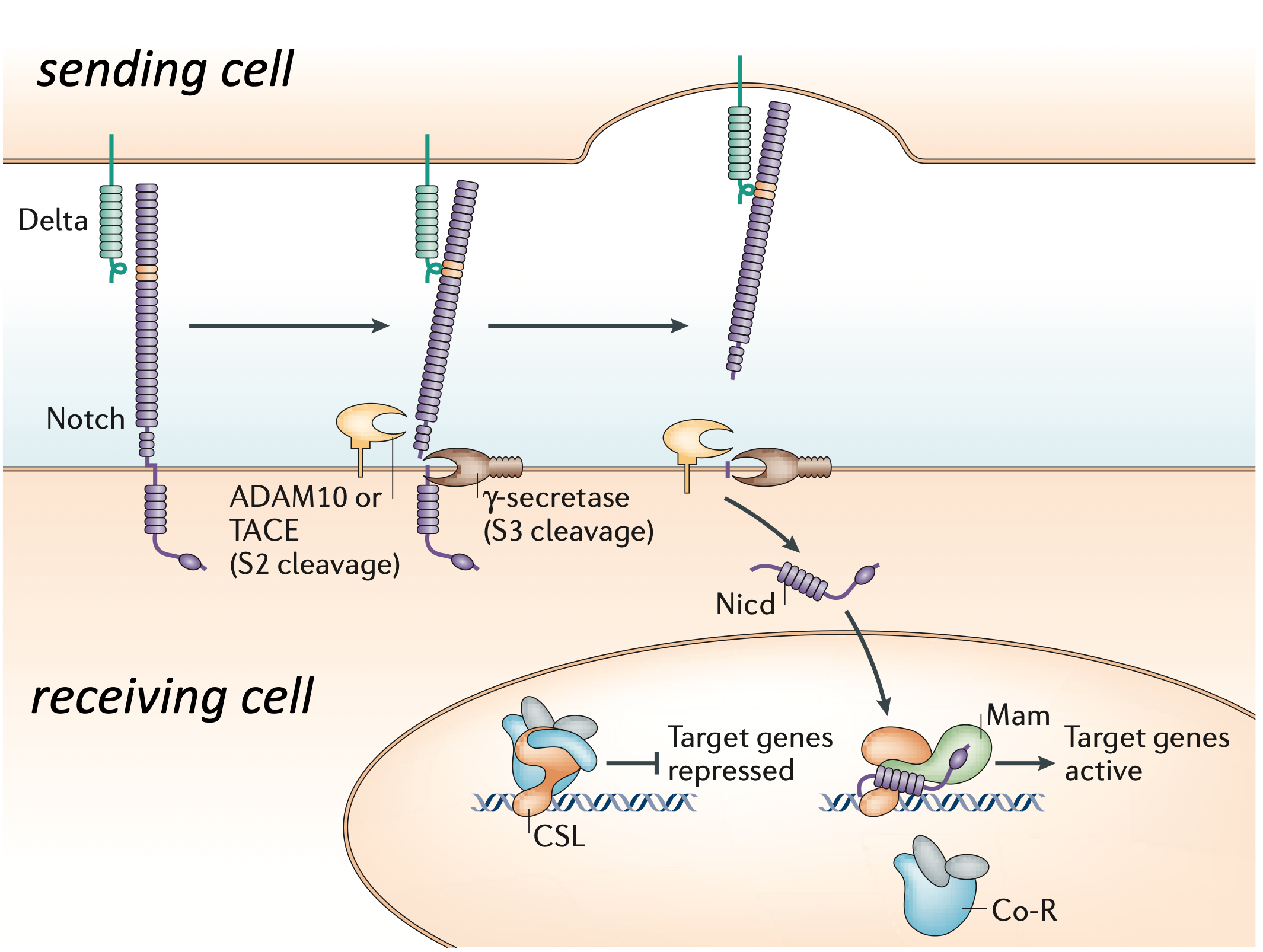 The Notch pathway is the preeminent example of juxtacrine signaling. It is involed in diverse physiological and developmental patterning processes, including the inner-ear and hair cell examples shown above. Notch pathway ligands, known as Delta and Jagged (or Serrate), and Notch receptors are all single-pass transmembrane proteins expressed on the surface of cells. A Notch receptor on one cell can bind to a Delta or Jagged ligand on an adjacent cell. Subsequently, mechanical force generated by endocytosis of the ligand in the signal sending cell leads to the cleavage of the Notch receptor and the consequent release of its intracellular domain (NICD) within the cell. Once released, the NICD translocates to the nucleus, where it activates transcription of Notch pathway target genes.