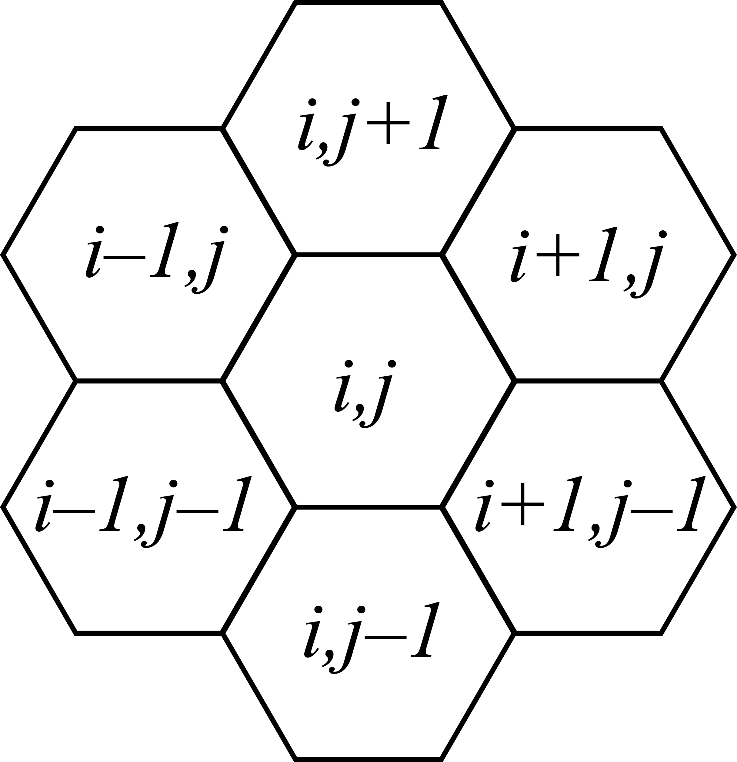title="non-cooperative cis-inhibition, 8x8 periodic hexagonal grid"