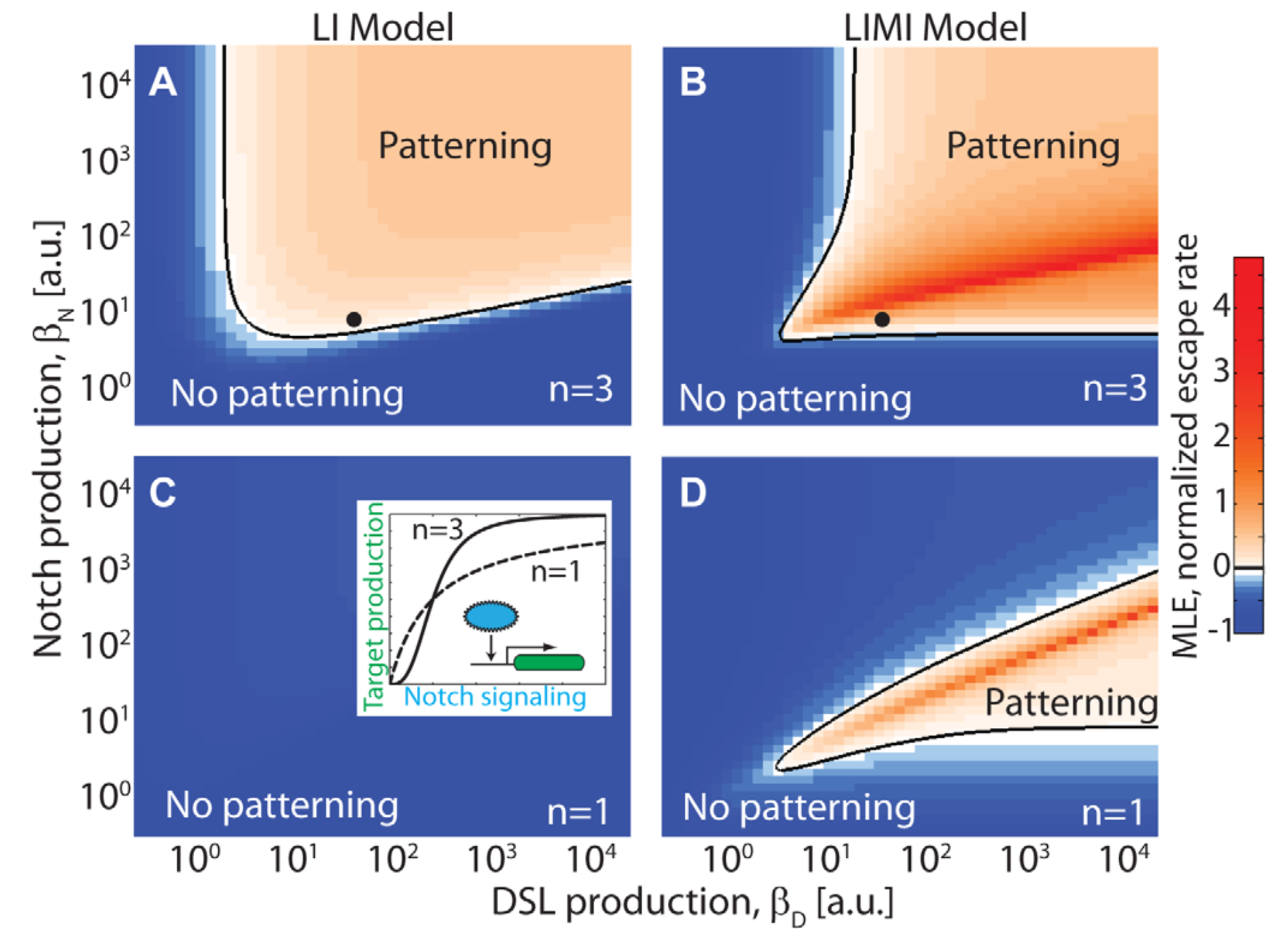 After performing the linear stability analysis, Sprinzak et al. found that the model without cis-inhibition (the LI model) was unable to spontaneously form patterns when the activation of the reporter by Notch (\(n_R\) in our model) was not cooperative. In contrast, the model with cis-inhibition (the LIMI model) had a region of parameter space where spontaneous pattern formation might be possible.